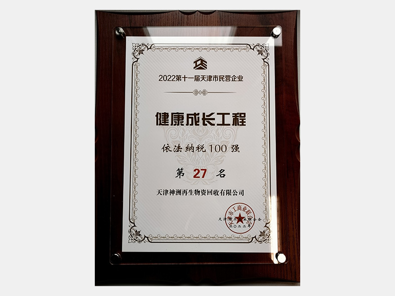 2022第十一屆天津市民營企業(yè)健康成長工程依法納稅100強第27名