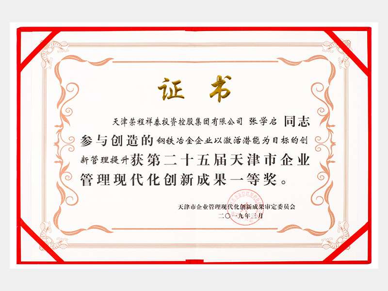 張學啟同志參與創造的鋼鐵冶金企業以激活潛能為目標的創新管理提升獲第二十五屆天津市企業管理現代化創新成果一等獎。